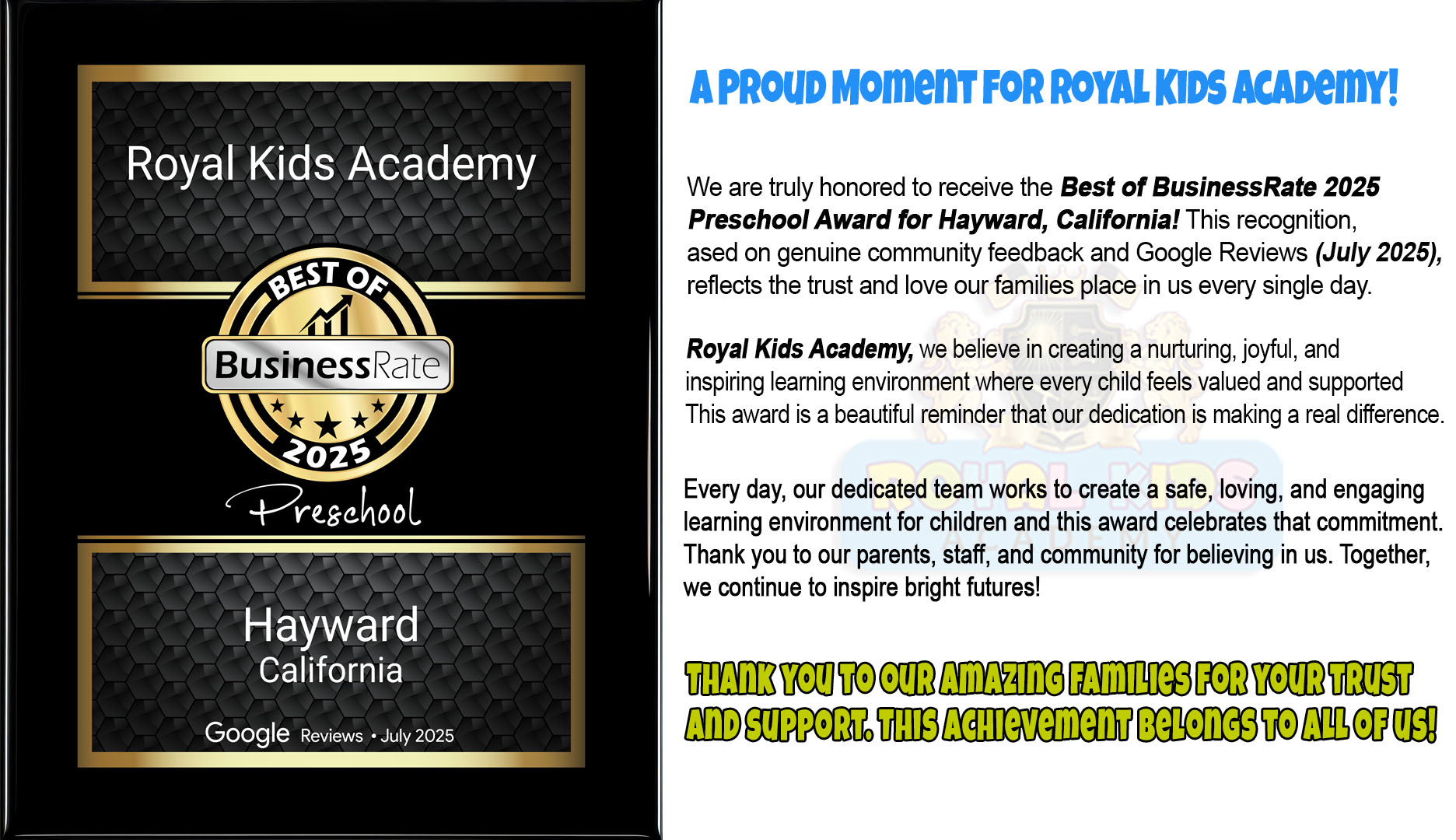 Royal Kid's Academy, we aim to provide highest quality education to every child. We strive to prepare the child in the best way possible. Our team of trained staff offers quality education, care, guidance and a loving atmosphere to take children close to success and away from disappointment.